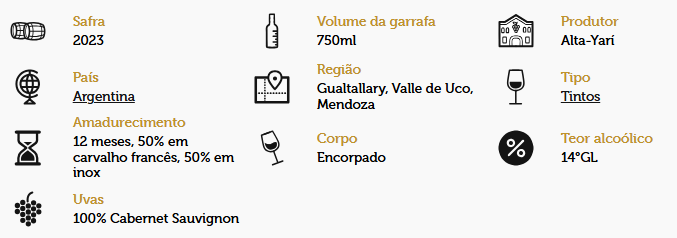 Sirva entre 16-18°C para aproveitar toda sua sofisticação. Descubra a excelência do Cabernet Sauvignon Alta-Yarí Reserva!