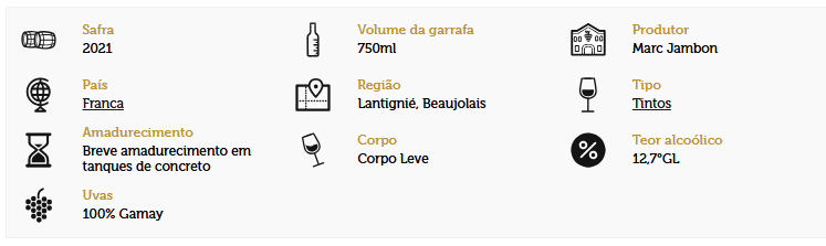 O Vinho Beaujolais-Villages Marc Jambon encanta com sua coloração rubi vibrante e aromas frescos de frutas vermelhas, com sutis notas florais. Seu paladar é leve, elegante e perfeitamente equilibrado, ideal para acompanhar carnes, queijos e pratos da culinária francesa.