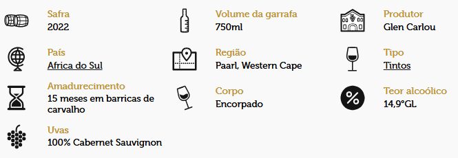 O Vinho Cabernet Sauvignon Glen Carlou é uma escolha sofisticada para os amantes de vinhos tintos encorpados. Com aromas intensos de frutas negras maduras e notas elegantes de especiarias, apresenta um paladar equilibrado e taninos macios. Ideal para harmonizar com carnes vermelhas, queijos curados e pratos saborosos. Descubra a qualidade e a tradição deste Cabernet Sauvignon sul-africano, perfeito para momentos especiais.