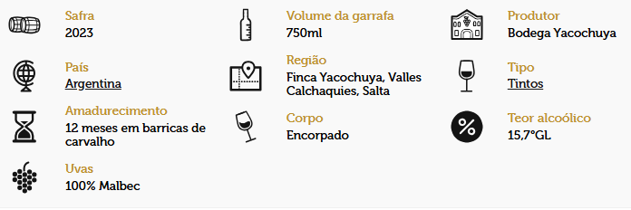 O Vinho Malbec San Pedro de Yacochuya apresenta uma coloração intensa e profunda, com aromas envolventes de frutas vermelhas maduras e delicadas notas especiadas. No paladar, revela um corpo médio, taninos macios e excelente equilíbrio, perfeito para harmonizar com carnes vermelhas e queijos curados.