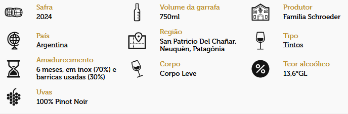 Vinho Pinot Noir Saurus Patagonia apresenta uma coloração rubi clara com nuances brilhantes. Seu aroma delicado revela notas de frutas vermelhas frescas, como cerejas e framboesas, com sutis toques terrosos. De corpo leve a médio, possui taninos suaves e sabor equilibrado, ideal para acompanhar pratos leves e momentos especiais.