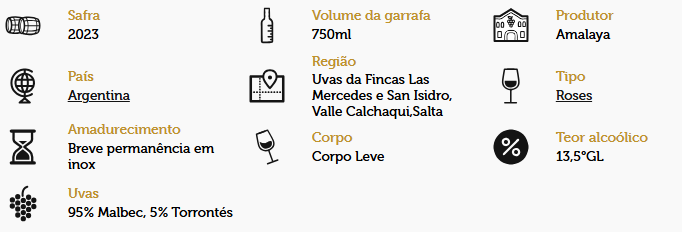 O Vinho Rosado Amalaya 750 ml é a escolha ideal para quem busca frescor e sofisticação. Com aromas intensos de frutas vermelhas e toques florais, oferece um paladar leve e equilibrado. Perfeito para acompanhar pratos leves, saladas e frutos do mar, este vinho argentino transforma seus momentos em experiências únicas e saborosas. Desfrute da elegância e do frescor em cada taça!