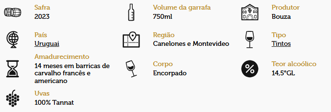 O Vinho Tinto Bouza Tannat 750ml destaca-se pela sua coloração vermelho rubi intensa e aromas marcantes de frutas vermelhas maduras com nuances de especiarias. Com corpo robusto e taninos estruturados, oferece um final equilibrado e persistente. Perfeito para acompanhar carnes vermelhas e pratos condimentados. Sirva entre 16-18°C para desfrutar de toda sua complexidade e sabor único.