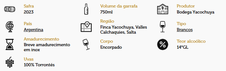 O Vinho Torrontés San Pedro de Yacochuya encanta pela sua coloração clara e aromas delicados de flores brancas e frutas cítricas. No paladar, apresenta-se fresco, leve e com uma acidez equilibrada, ideal para harmonizar com pratos leves, frutos do mar e saladas.
